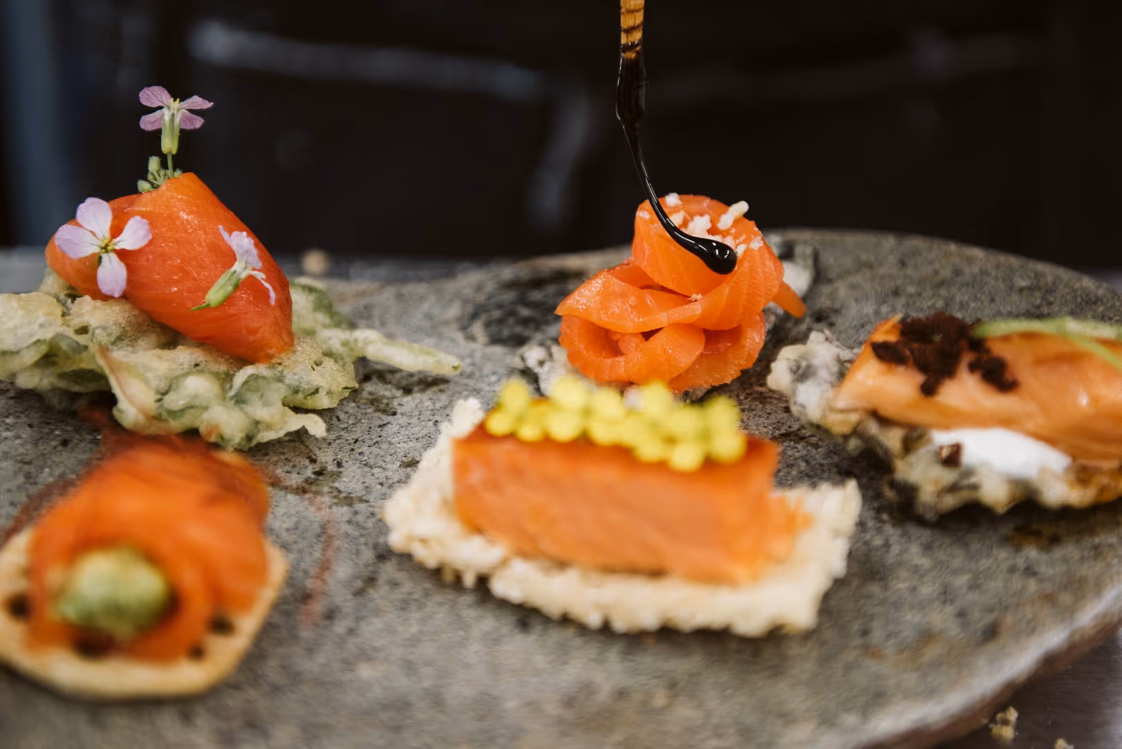 Add smoked salmon to tempura and crackers while they are still hot. Decoratively top with combinations of apple syrup, yoghurt, citrus zest and herb flowers. Serve and enjoy.