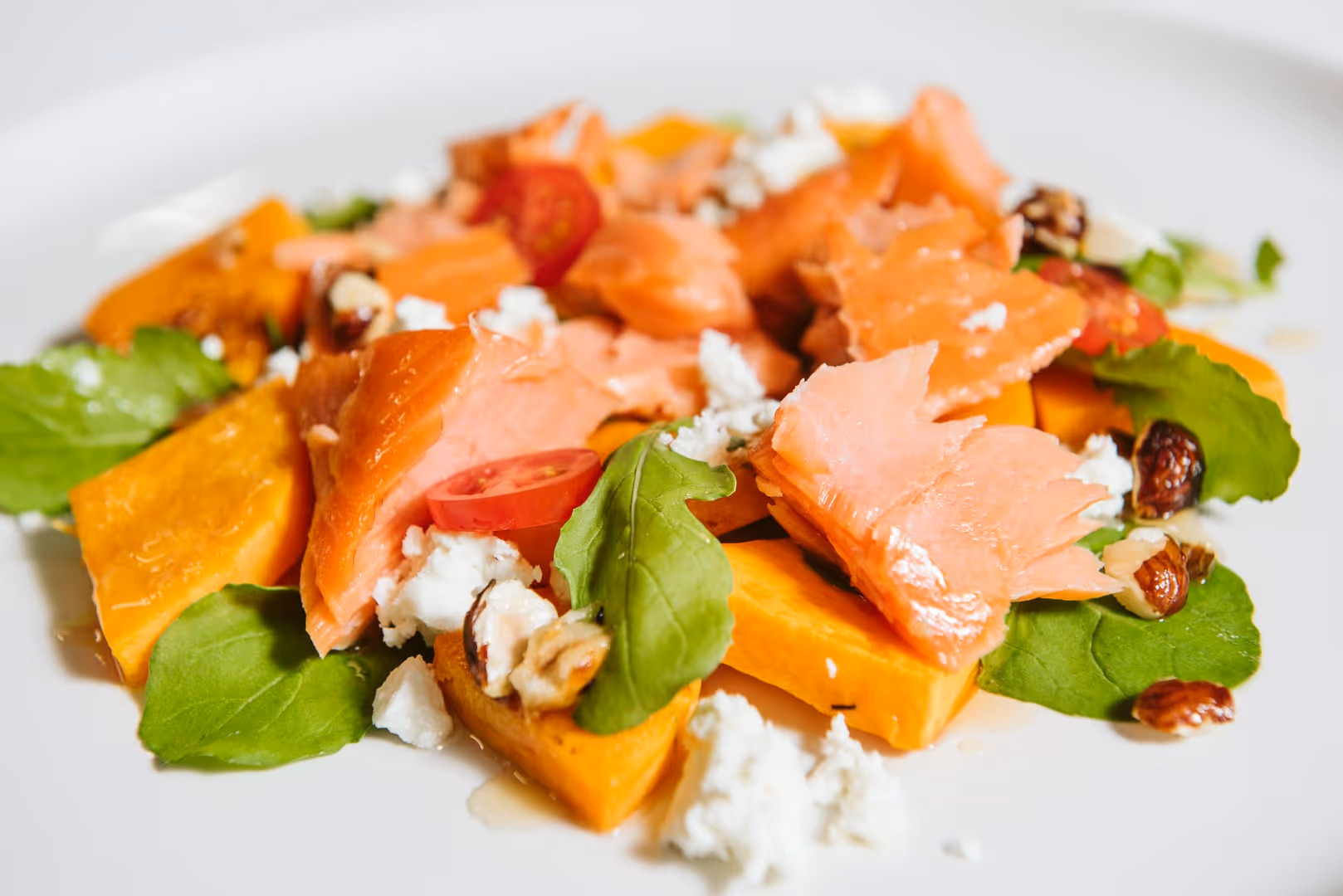 Autumnal ingredients and flavours set the stage for this dish. The sweetness of maple syrup and butternut squash are offset by the sharpness of goat milk feta cheese. Hazelnut oil mingles with the salmons omega oils and are gently caressed by the subtle Aoraki signature oak smoke. This is a salad that warms and satisfies on a cool day.