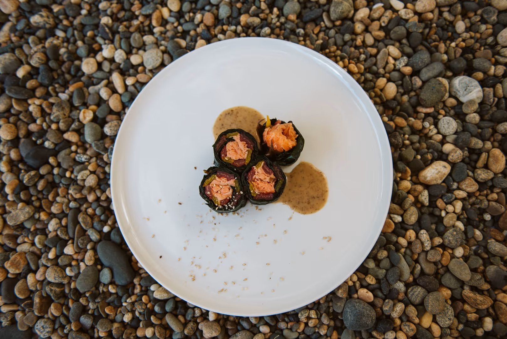 Slice into four roll pieces, stand on end and dress with sesame seed sauce. (Kewpie does a roasted sesame dressing available in most supermarkets, or you could make it from scratch*).