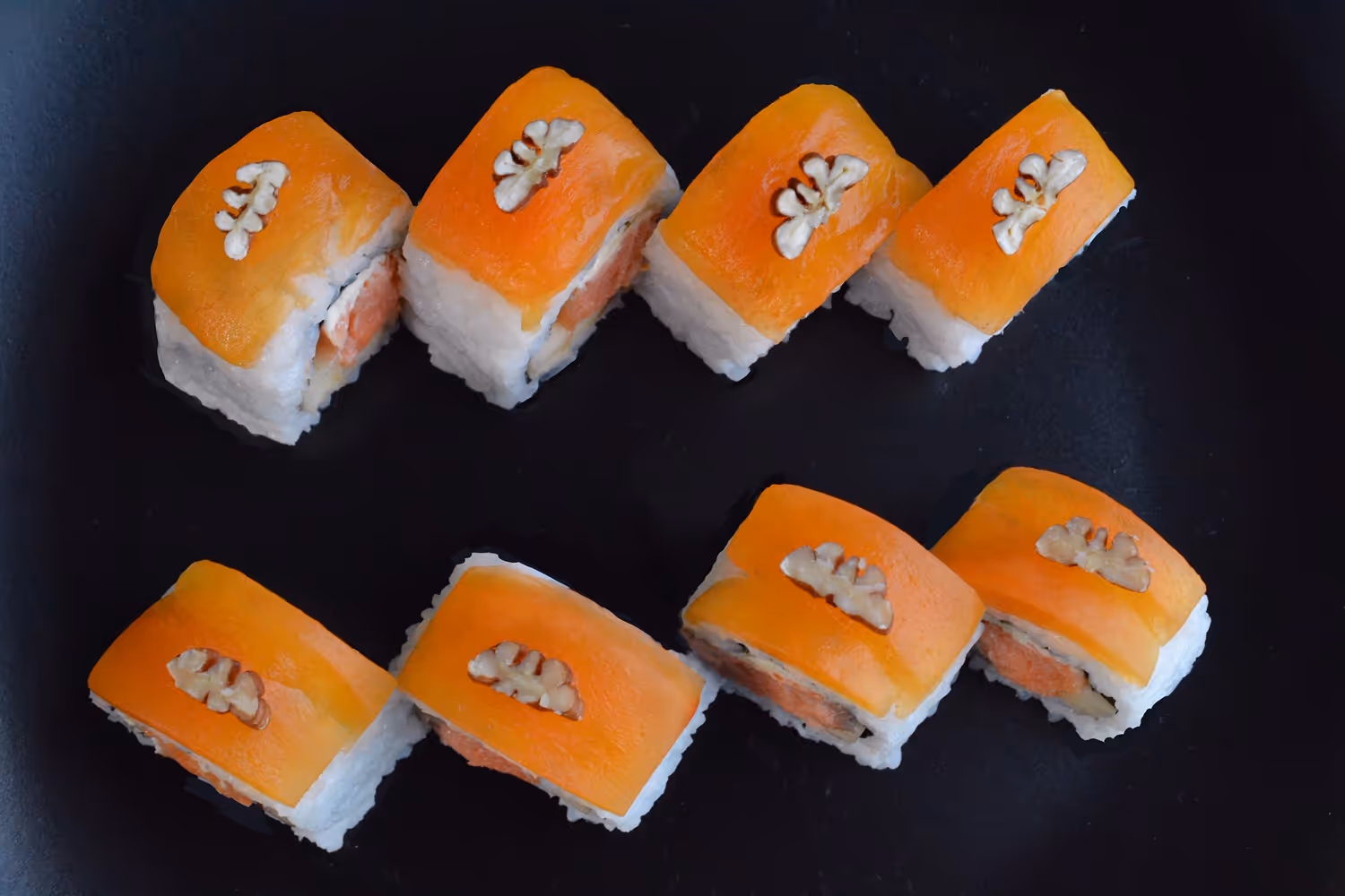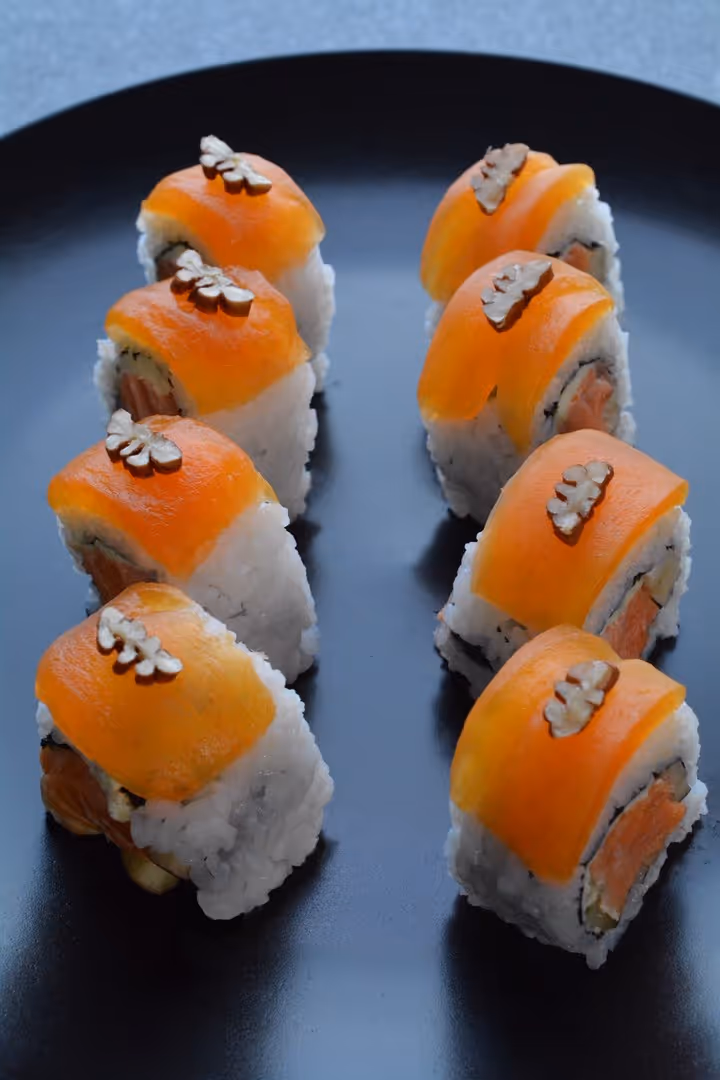 Sushi Tip: If you’re brave, for a dramatic presentation place slices of persimmon on top of the roll before cutting.