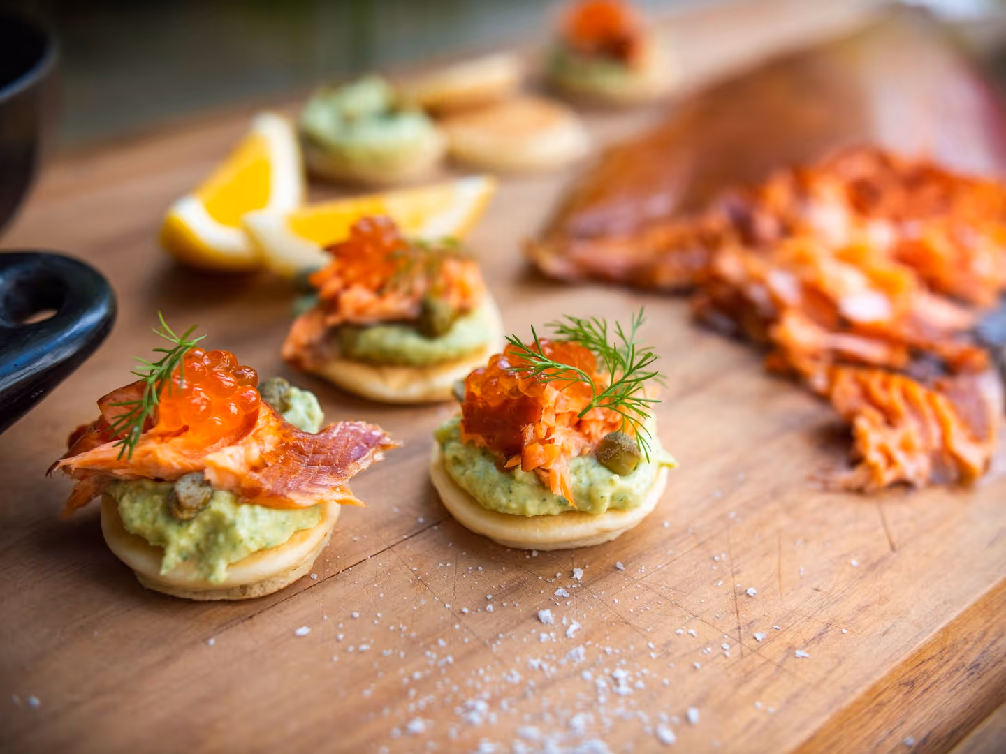 Pōhutukawa Hot Smoked Salmon blinis with avocado crème fraîche