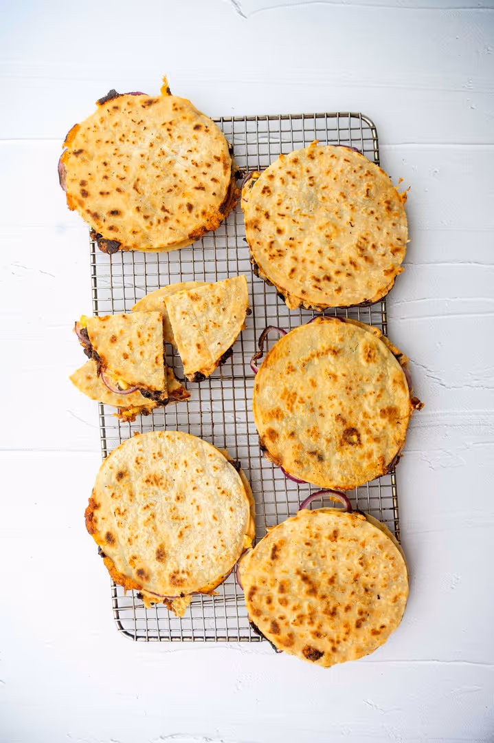 Clean out the pan you used to cook the beans, add a little oil then fry the quesadillas until golden brown and the cheese has melted. Keep the quesadillas in a warm oven as you go.