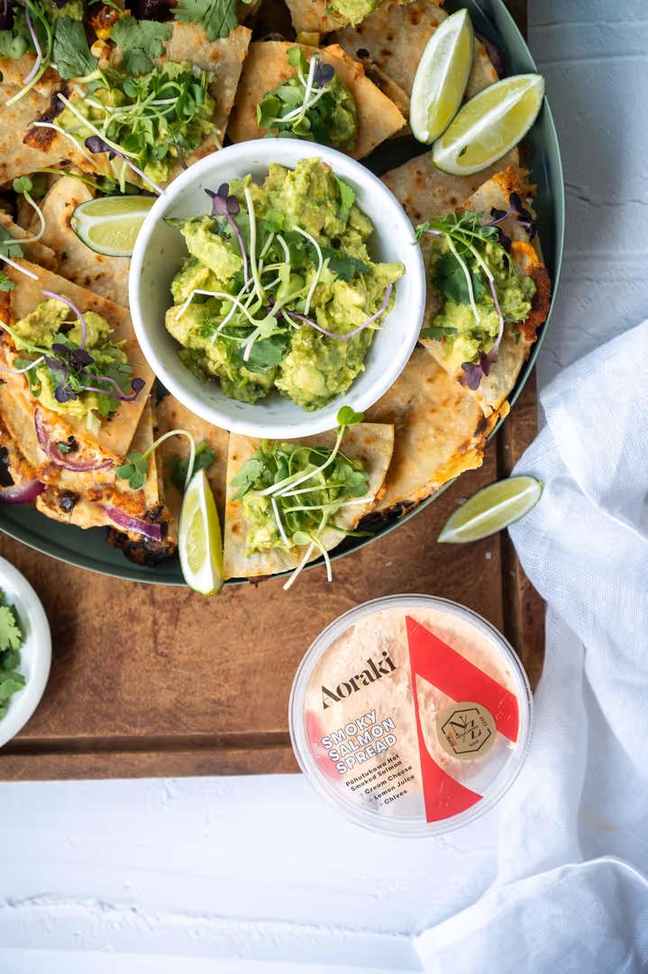 Quesadillas are a fantastic, fun meal to make any night of the week and one which the kids can get involved in too! We think ours are extra special as we’ve taken our smoked salmon spread and combined it with black beans, red onion, corn and cheese and topped it with bright, zingy guacamole. Great for lunch, dinner or even lunchboxes.