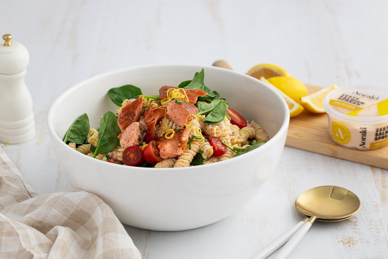 Fresh, vibrant, and ready in just 15 minutes, this Zesty Salmon Pasta Salad with Lemon & Spinach is the perfect balance of light and satisfying. Tender pasta is tossed with Aoraki Zesty Salmon Spread brightened by fresh lemon juice and zest, then folded through with baby spinach, juicy cherry tomatoes, and a hint of red onion for crunch. It’s an easy, flavour-packed dish that works beautifully for quick lunches, effortless dinners, or make-ahead meals throughout the week.
